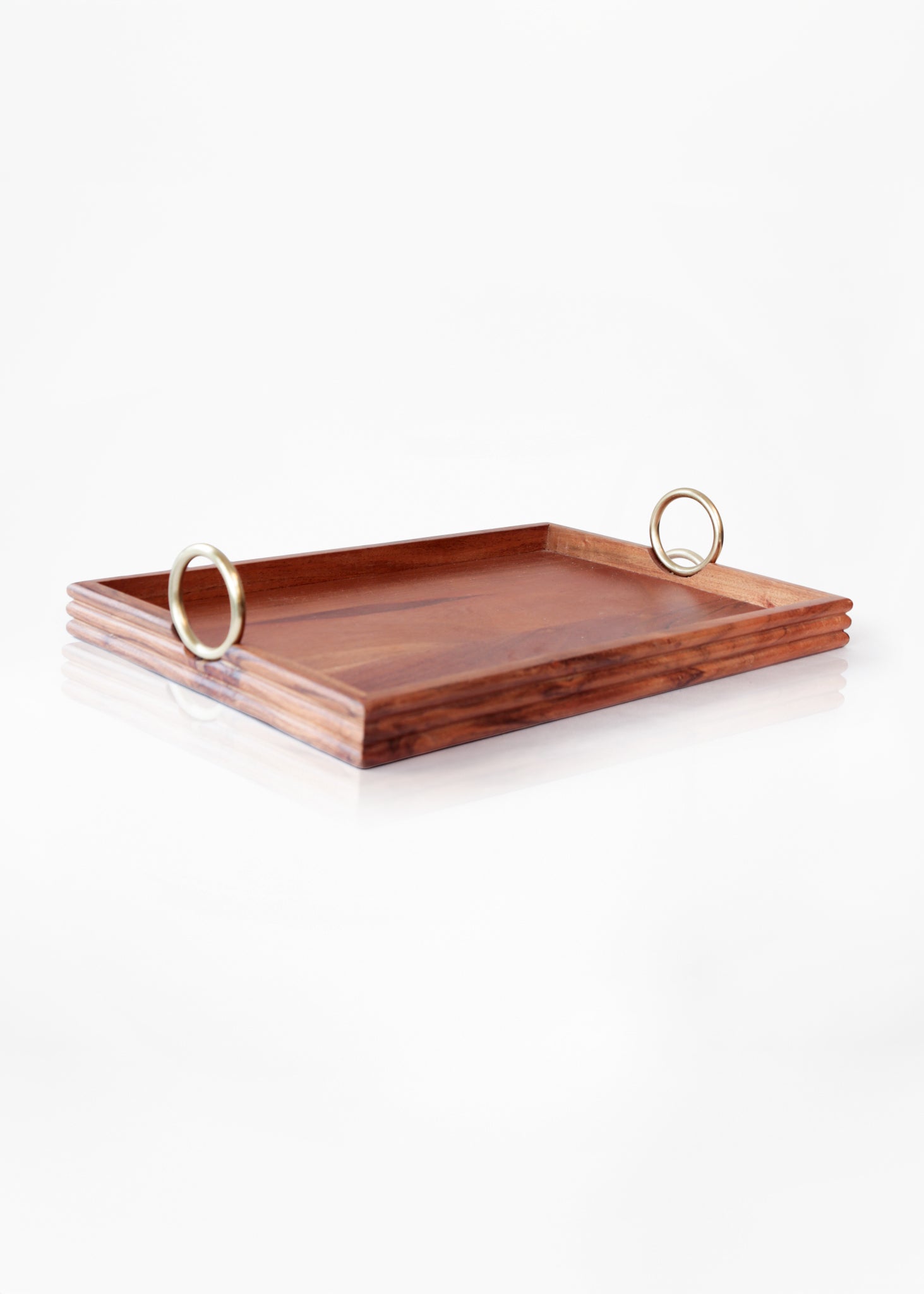 Bandeja rectangular en madera con agarraderas redondas en acero color dorado