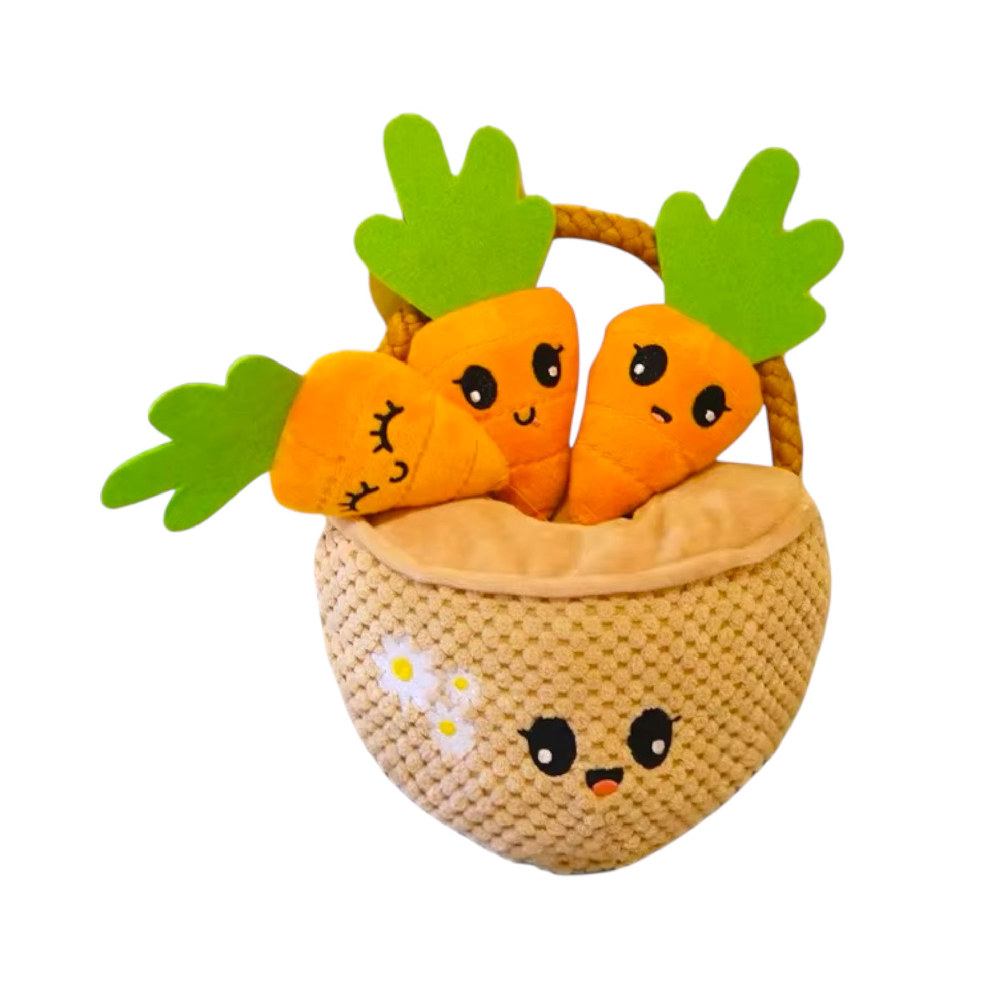 Canasta de peluche interactiva diseñada para estimular el juego y la diversión de tu perro. Cuenta con un chirrido integrado que captura la atención y mantiene a tu mascota entretenida. Las zanahorias removibles permiten jugar de forma independiente, ofreciendo variedad en las sesiones de juego. El interior es perfecto para guardar snacks y premios, convirtiéndola en una herramienta versátil para entrenamiento y recompensas. Ideal para perros que disfrutan de juguetes multifuncionales que combinan textura suave, sonidos atractivos y capacidad de almacenamiento.