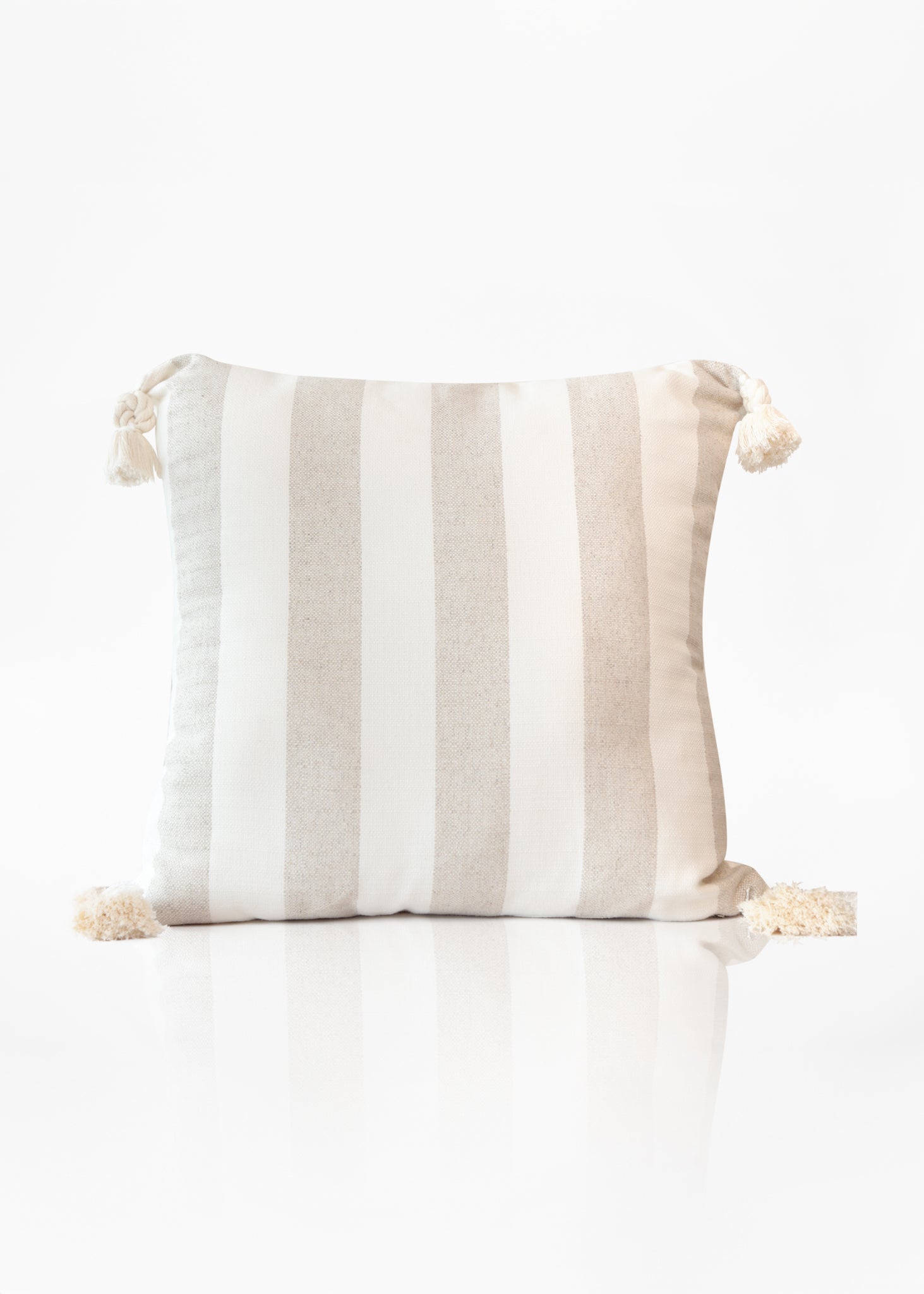 Cojín rectangular decorativo con franjas anchas en tonos beige y blanco. Presenta borlas en las esquinas, aportando un toque bohemio y relajado, ideal para espacios acogedores y naturales.