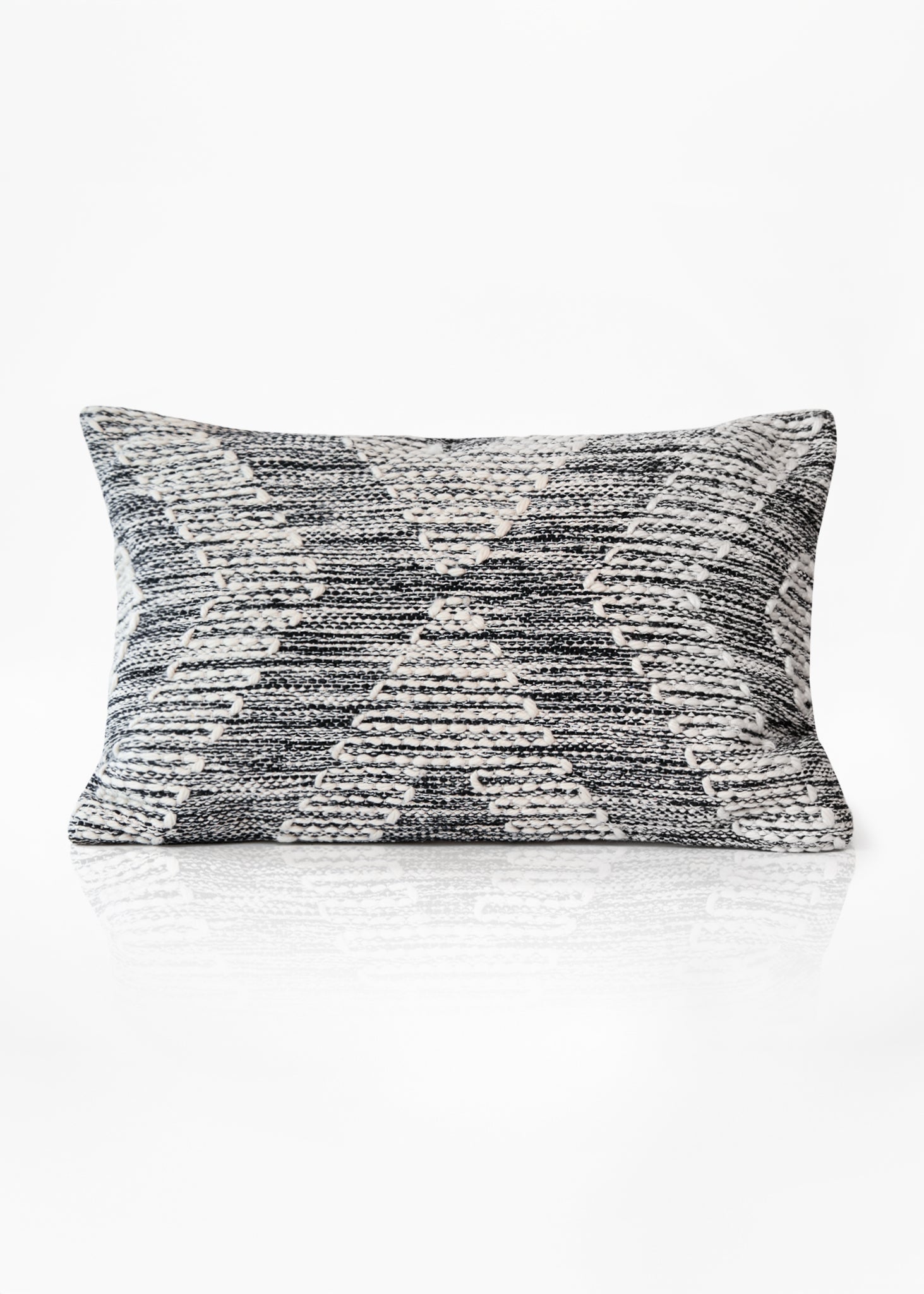 Cojín decorativo tejido a mano, con un diseño geométrico en tonos neutros que combina negro, gris y blanco, ideal para añadir textura y estilo a cualquier sofá o sillón. Su confección artesanal y su relleno suave lo convierten en una pieza cómoda y estética, perfecta para interiores modernos, bohemios o nórdicos. Un acento elegante que eleva la calidez del ambiente.