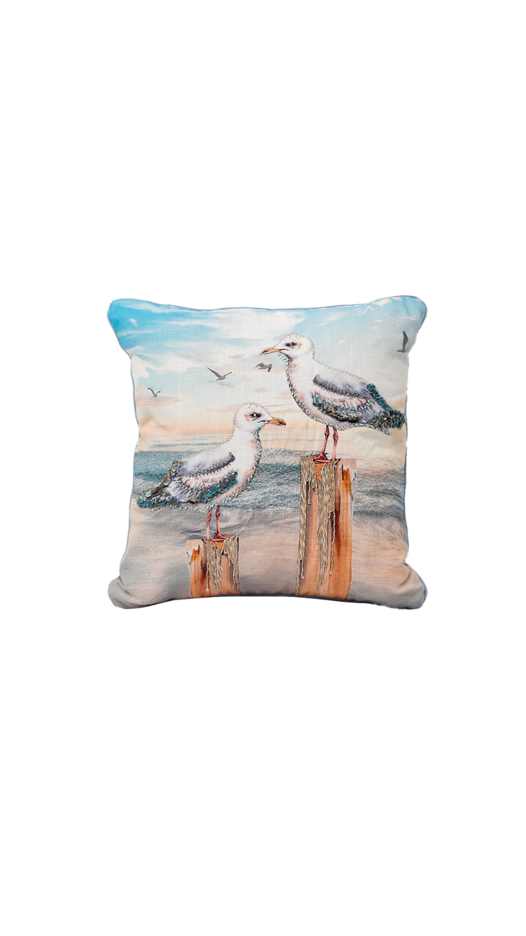 Cojín decorativo con diseño costero de gaviotas sobre postes de madera frente al mar. Ideal para añadir un toque náutico y relajante a cualquier espacio, ya sea en interiores o en una casa de playa.
