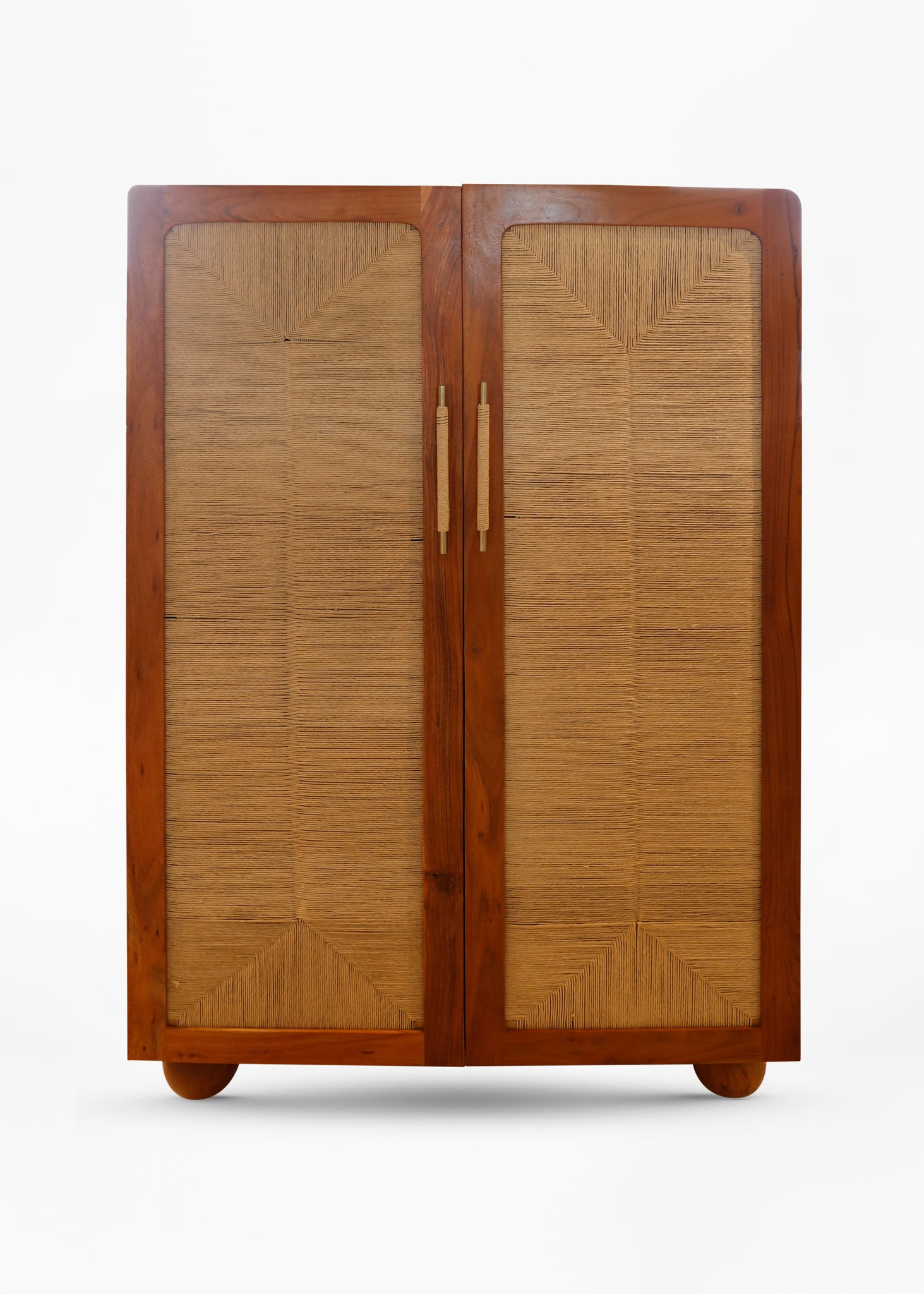 Gabinete de madera con puertas decoradas con tejido natural en patrón geométrico. Tiene dos tiradores metálicos verticales y base con patas esféricas, ideal para un estilo rústico o boho.