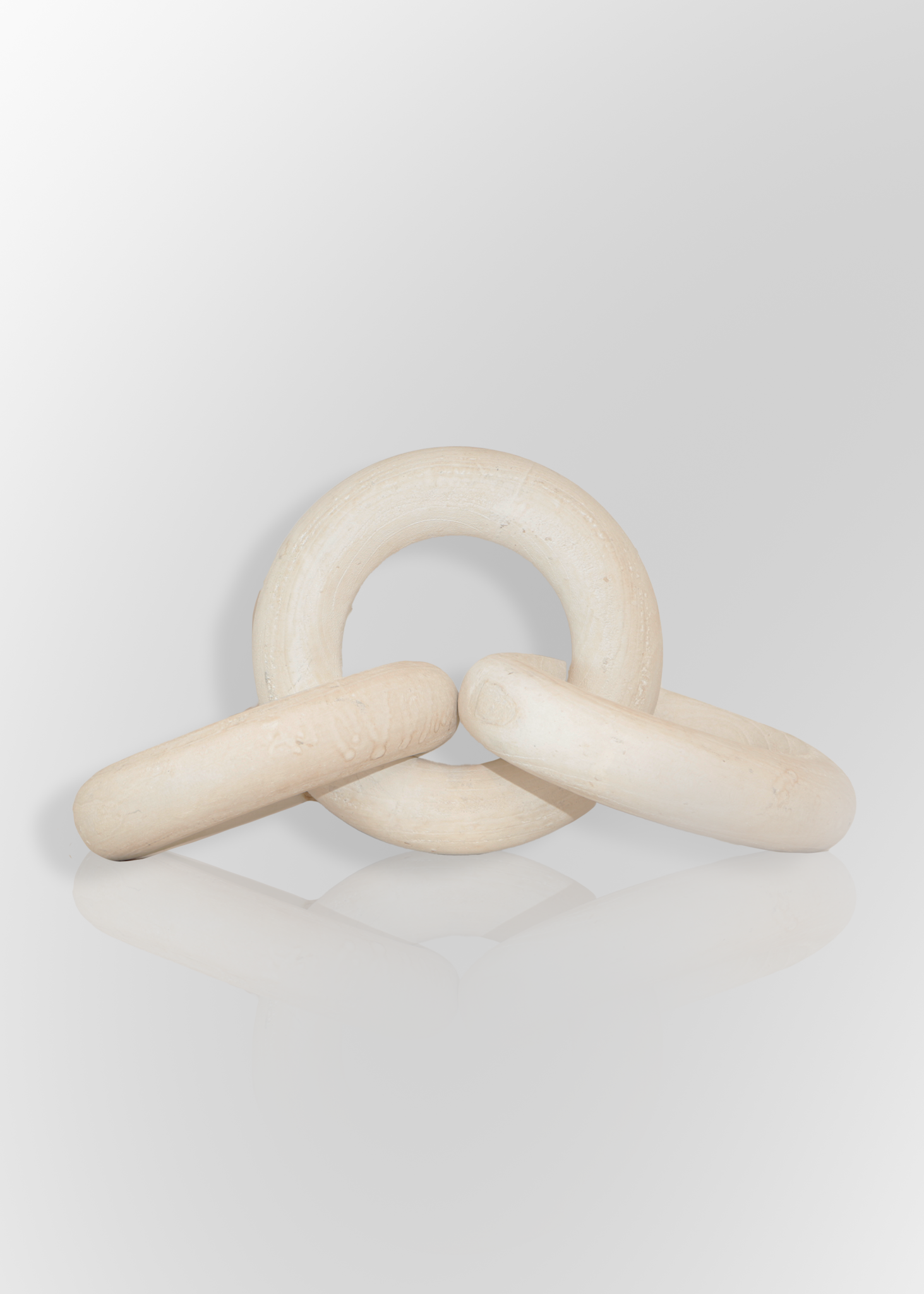 Figura decorativa de eslabones entrelazados en acabado blanco mate. Ideal para dar un toque moderno y escultórico a mesas, repisas o centros de sala.