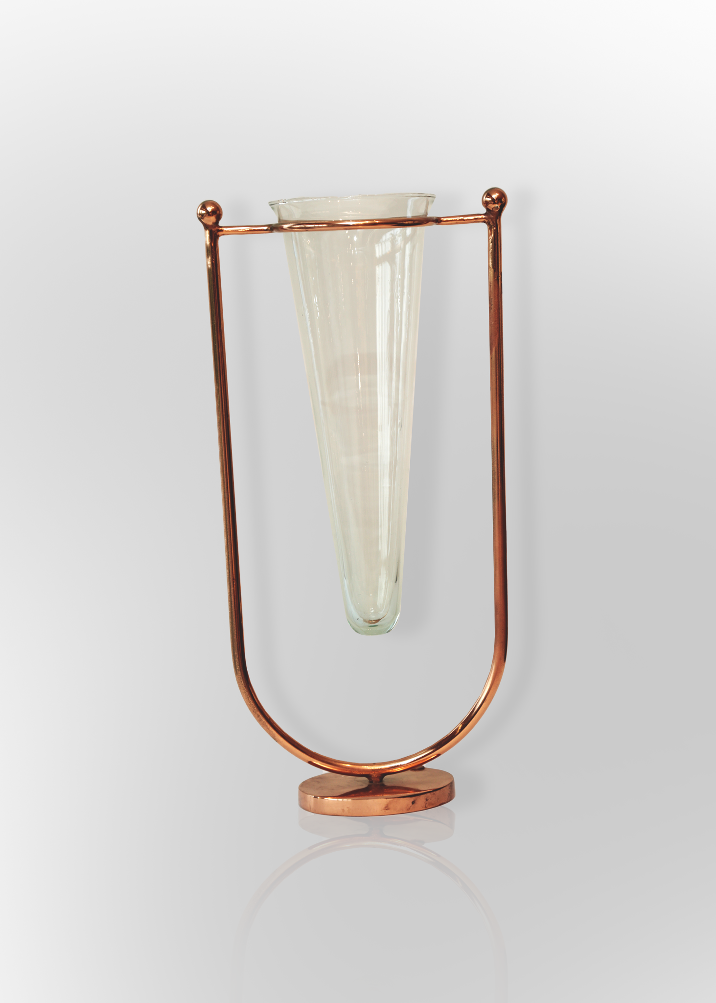 Florero decorativo de vidrio suspendido en una elegante estructura metálica color cobre. Un diseño moderno y sofisticado que aporta estilo y ligereza a cualquier espacio.