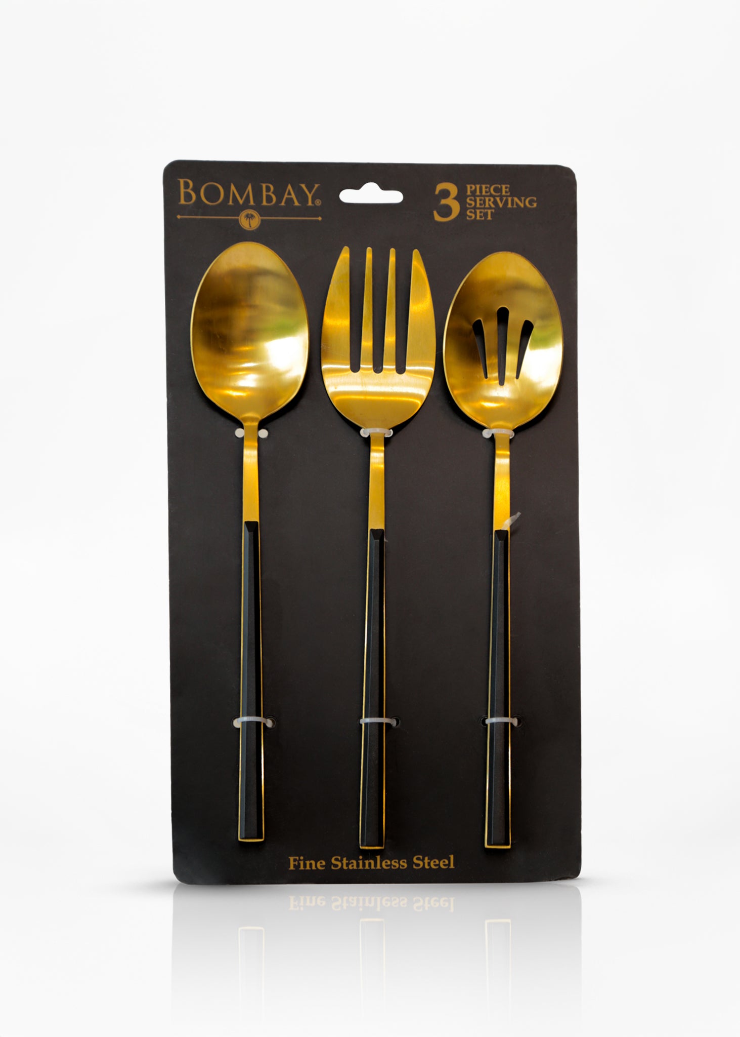 Accesorios decorativos para mesa, cubiertos con mango negro y terminacion dorado en acero inoxidable.