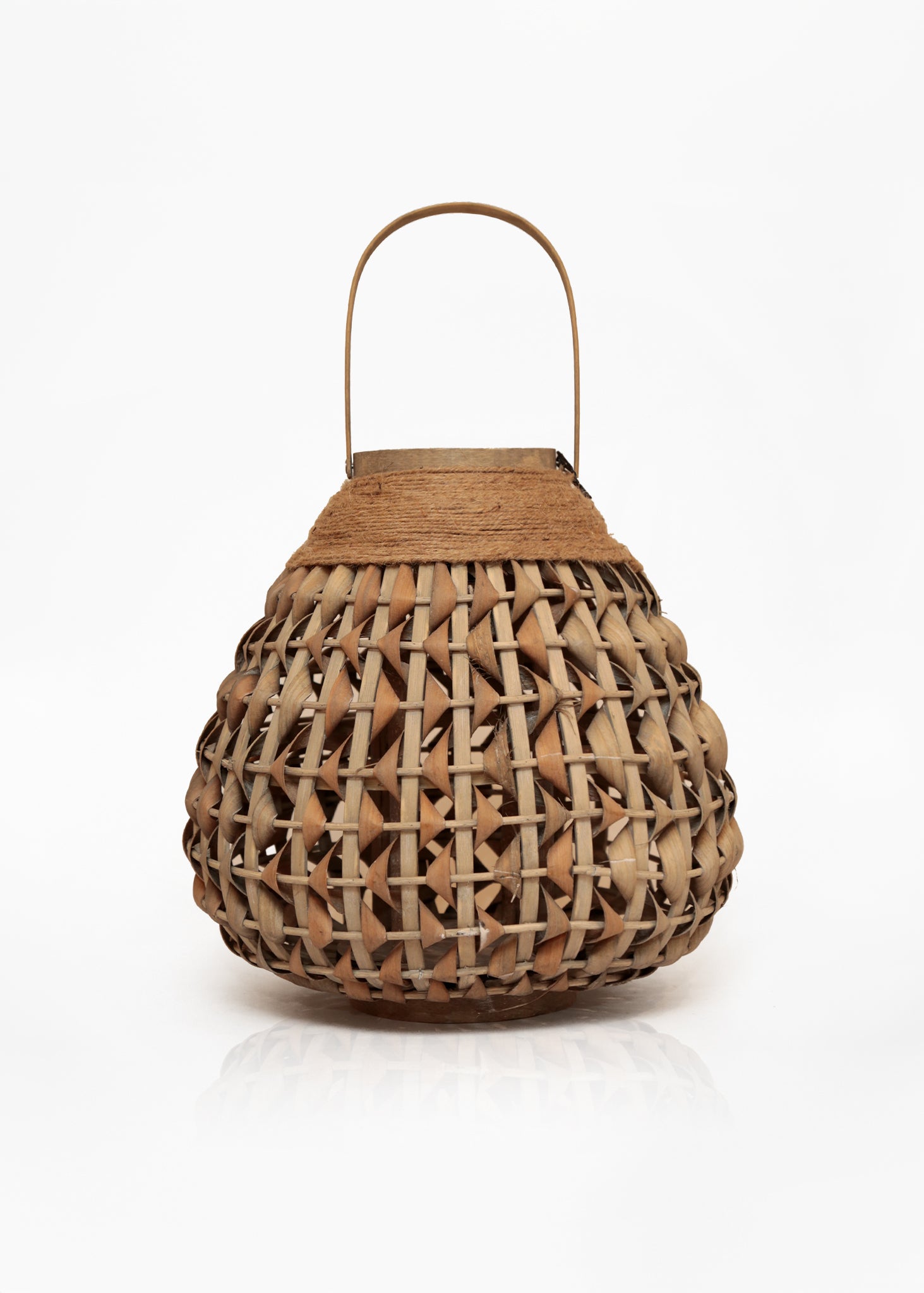 Farol decorativo de mimbre, estilo natural con asa superior.