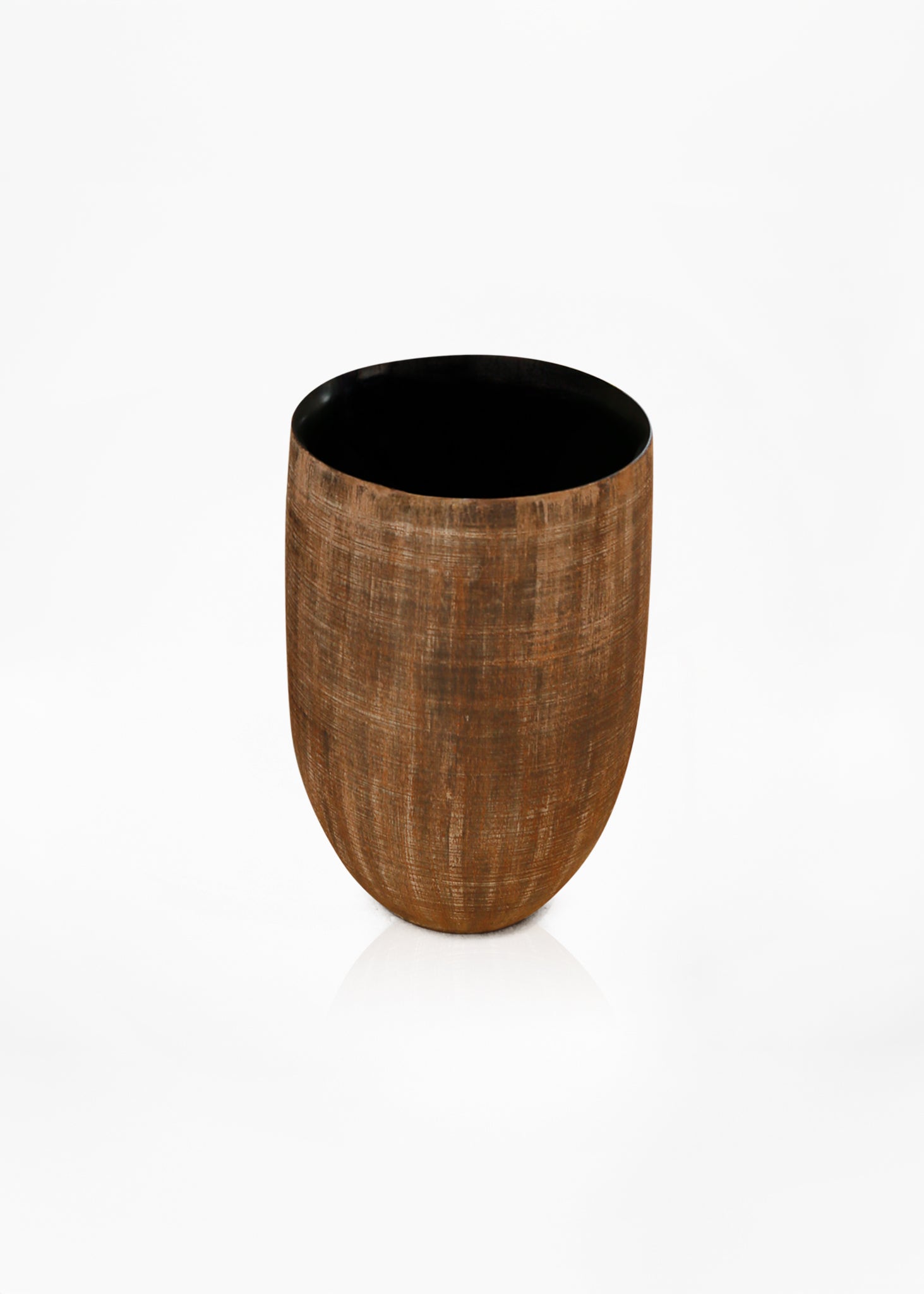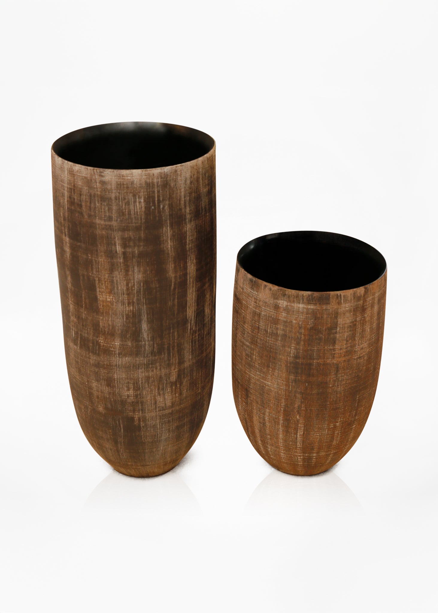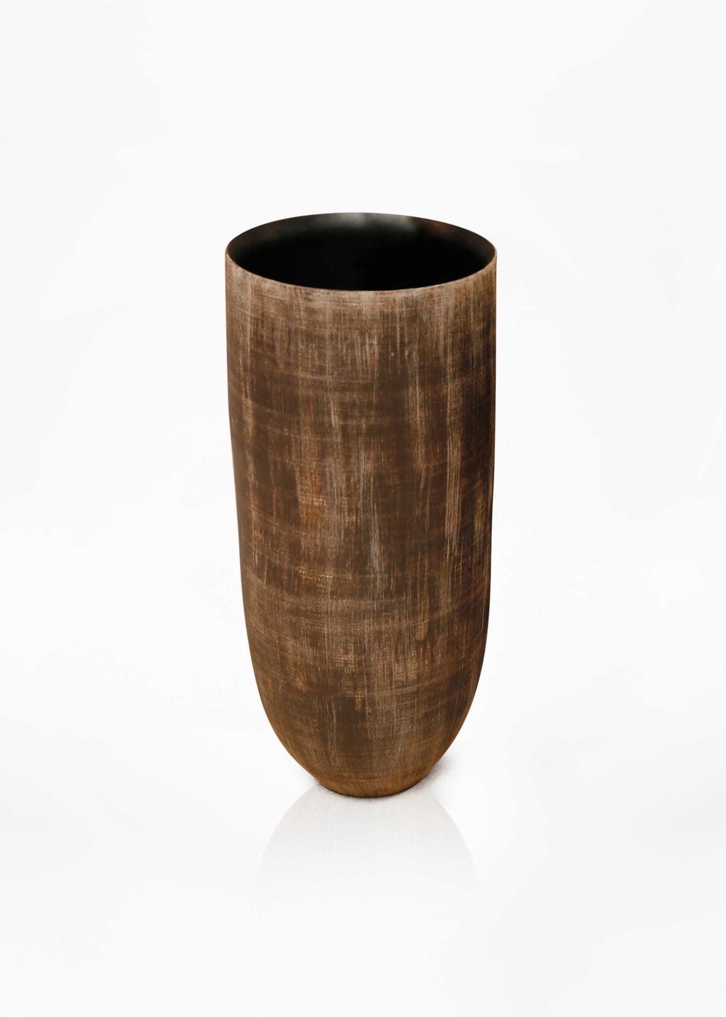 Matera decorativa alta para hogares, oficinas y otros espacios, los cuales pueden tener plantas sembradas o simplemente hojas.