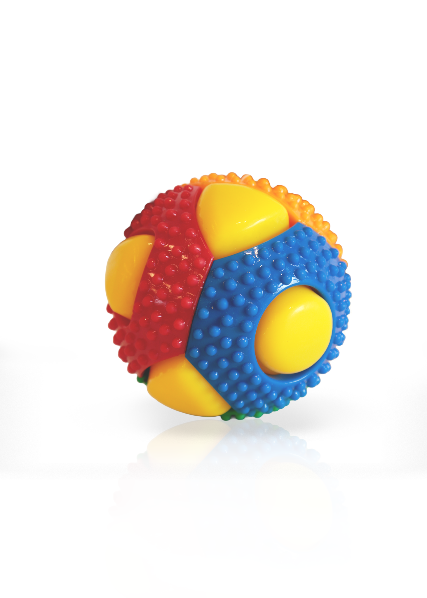 Pelota para perro de goma durable con textura multisensorial. Ideal para morder, jugar y estimular los sentidos, gracias a sus colores brillantes y superficie con relieves.