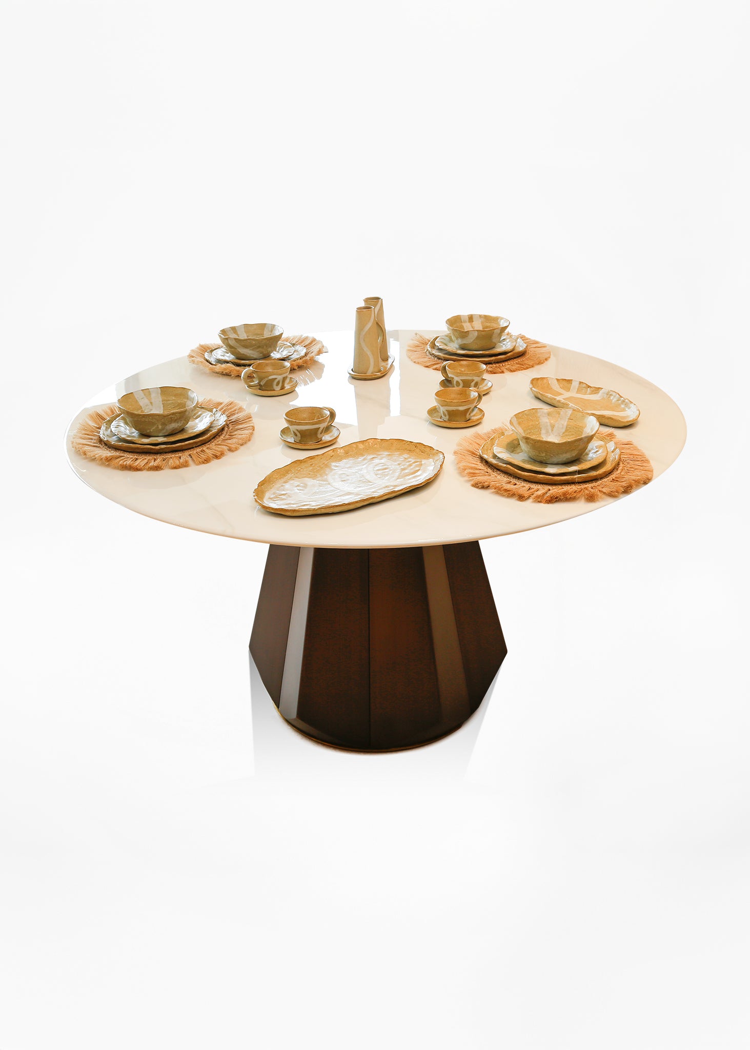 Mesa de comedor elegante con base geométrica en acabado madera y cubierta de mármol. Un diseño sofisticado que combina estilo y funcionalidad para realzar cualquier espacio.