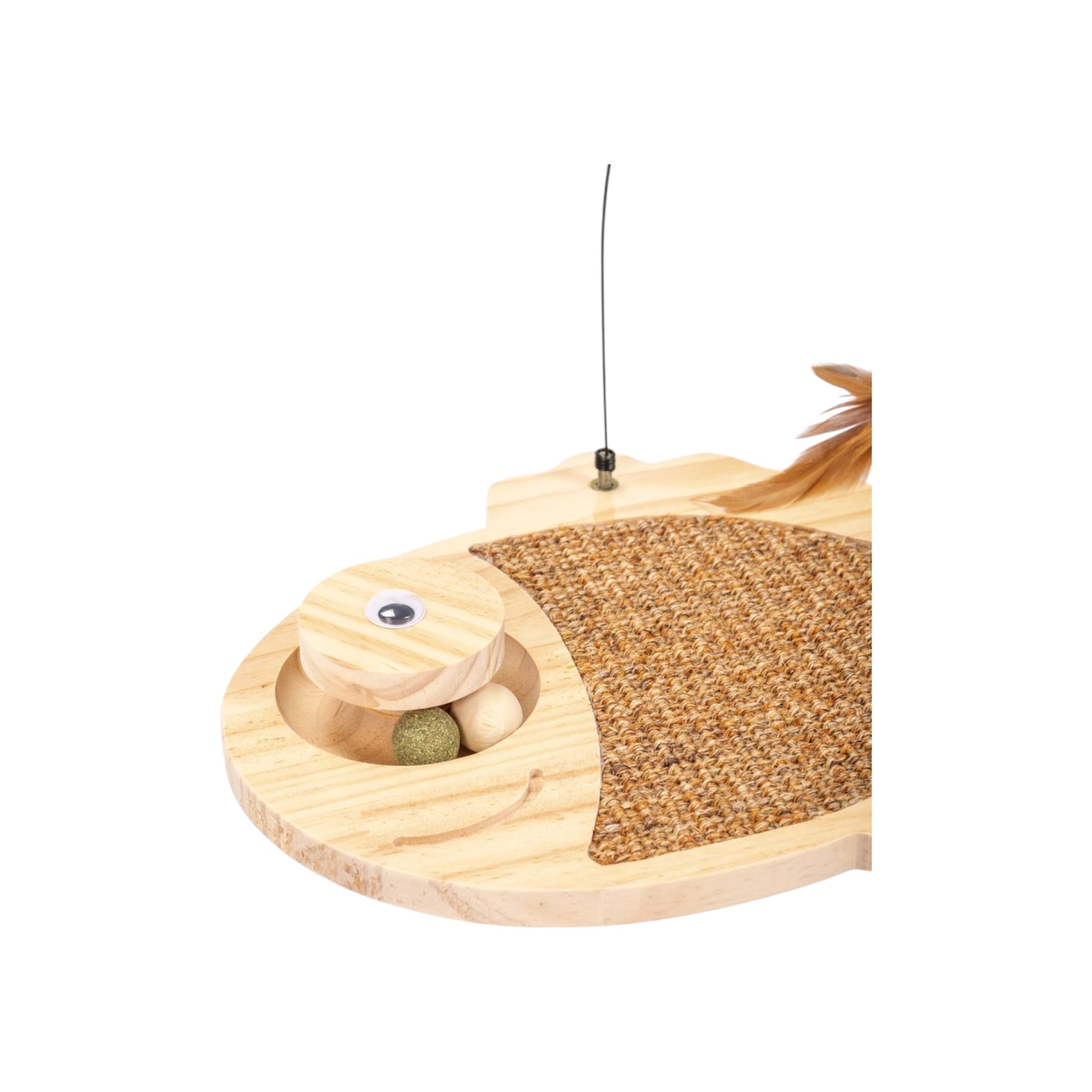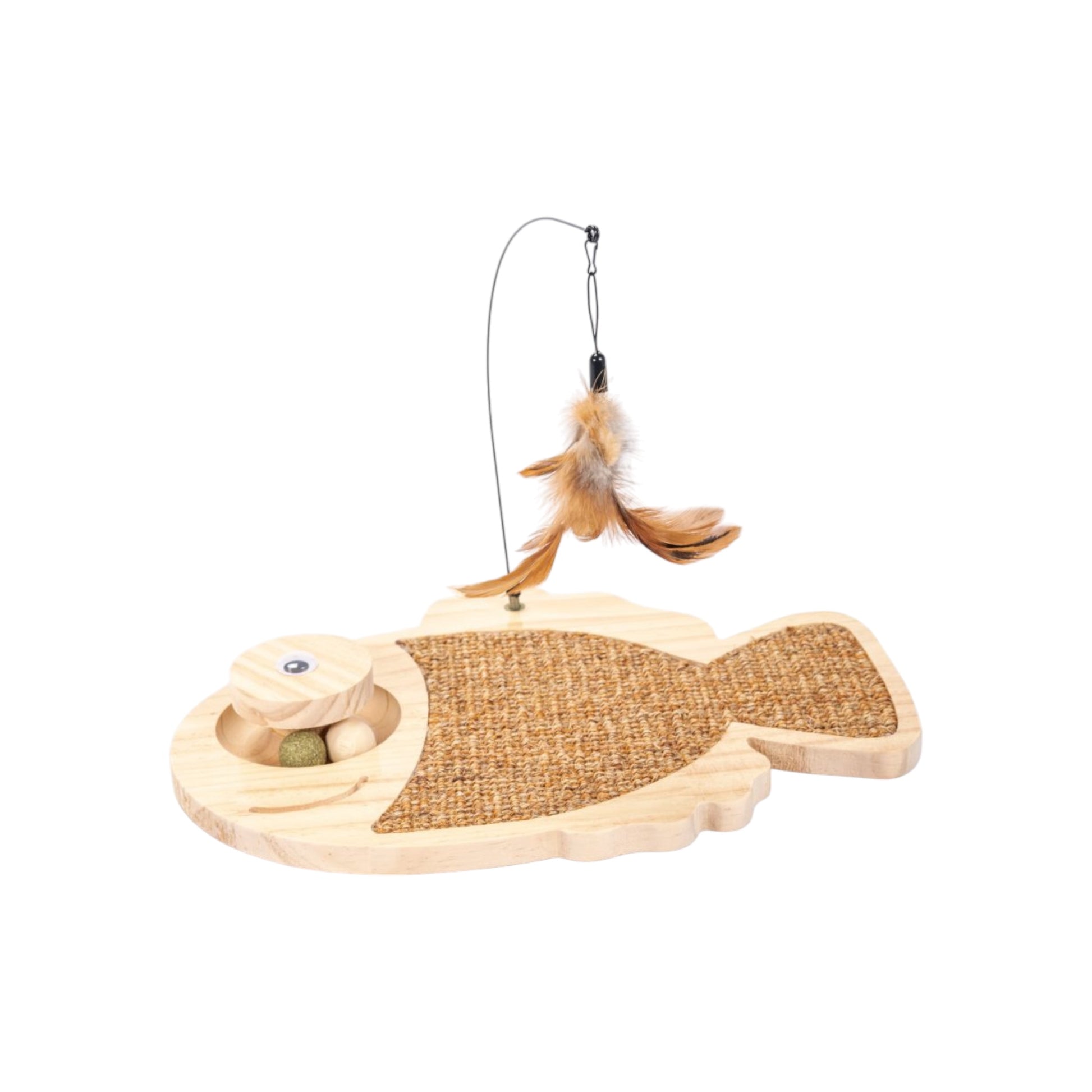 Rascador interactivo diseñado para estimular los instintos naturales de tu gato. Su forma de pez con pluma integrada proporciona entretenimiento continuo y ayuda a mantener a tu mascota activa y comprometida. La textura rugosa satisface la necesidad de rascar, protegiendo tus muebles mientras fortalece los músculos de las patas. Ideal para gatos de todas las edades, combina juego y cuidado en un solo producto versátil.