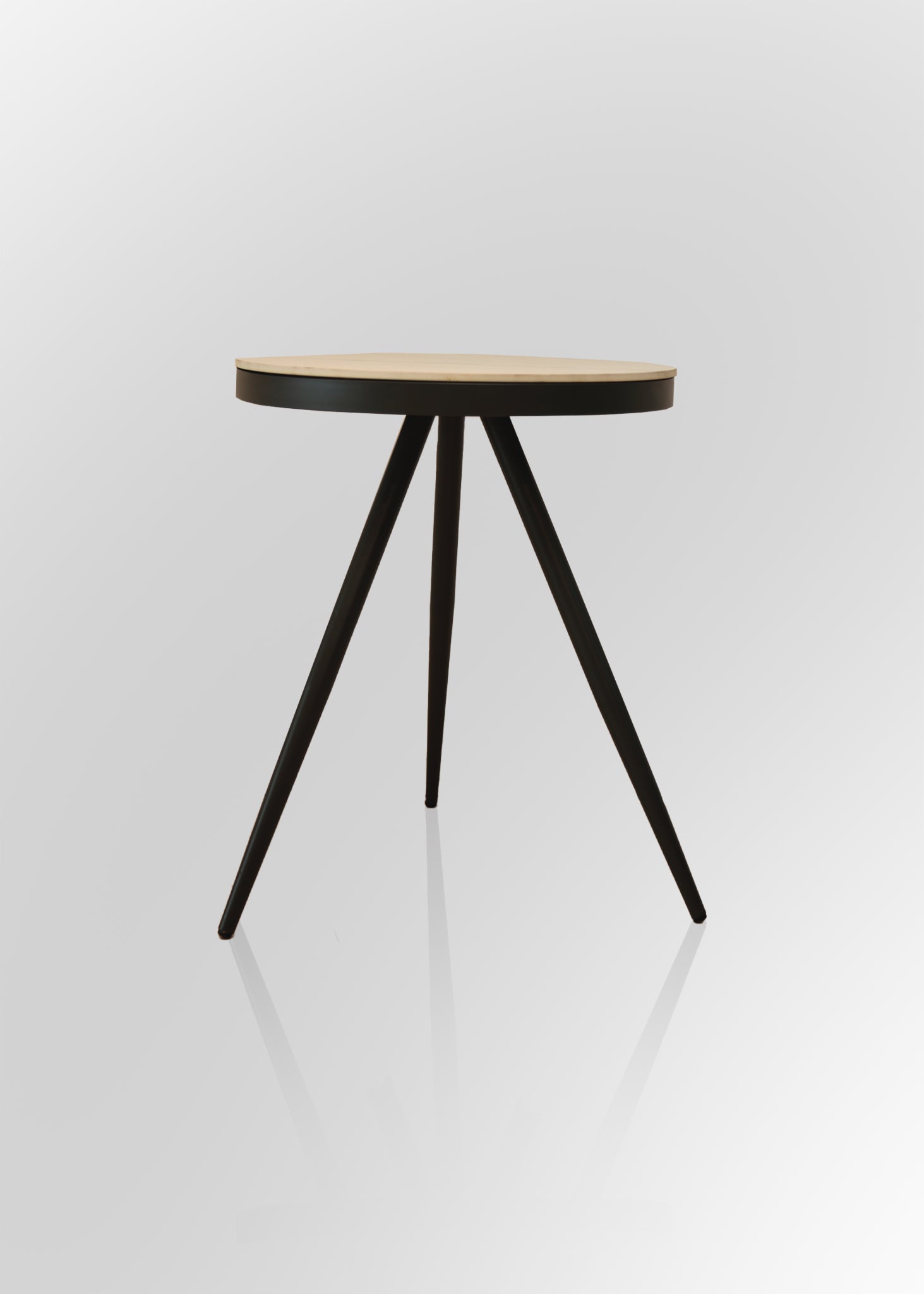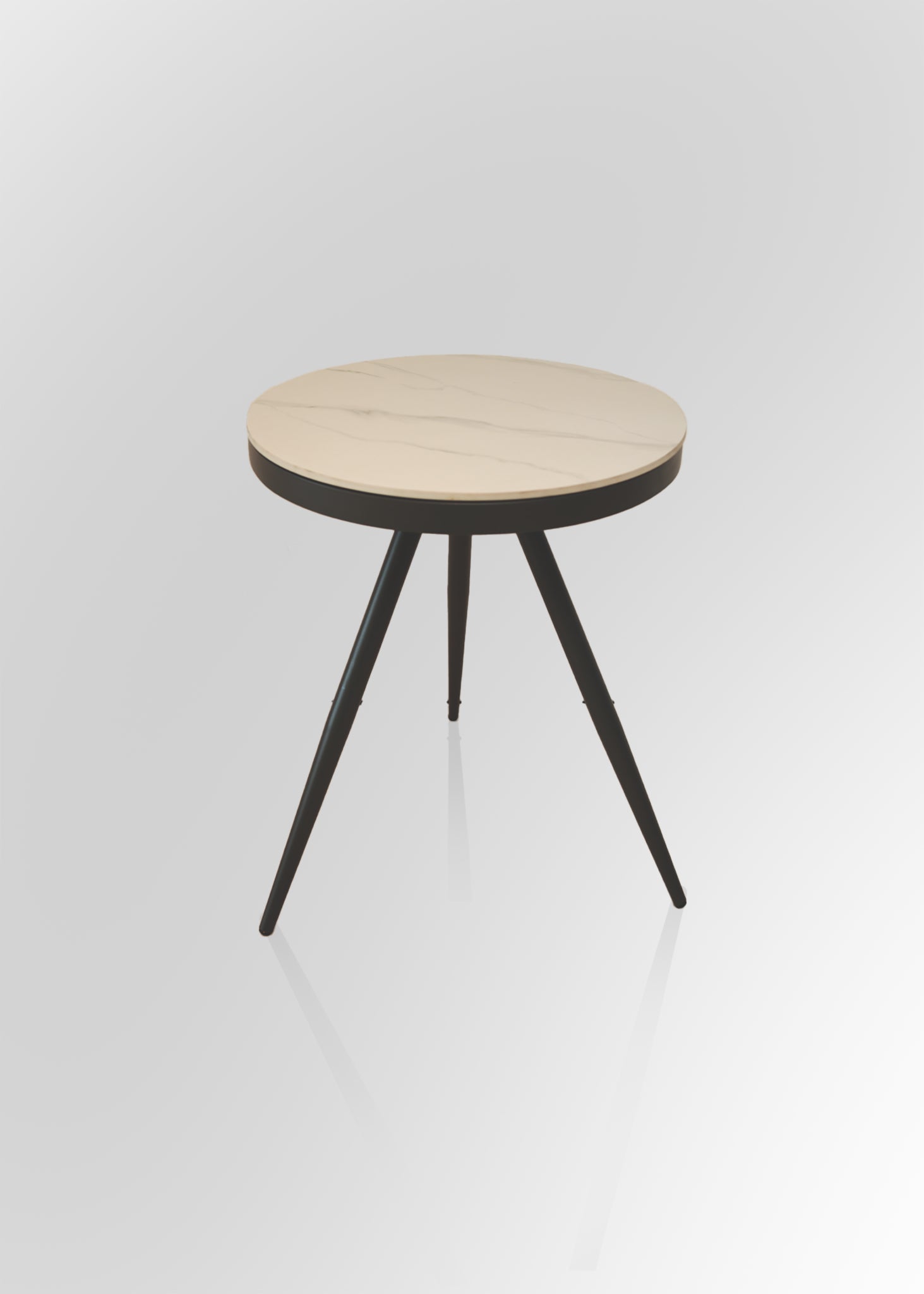 Juego de terraza moderno con mesa redonda de cubierta en sinterizado tipo marmol y dos sillas con estructura metálica y respaldo tejido. Perfecto para exteriores con estilo y confort.