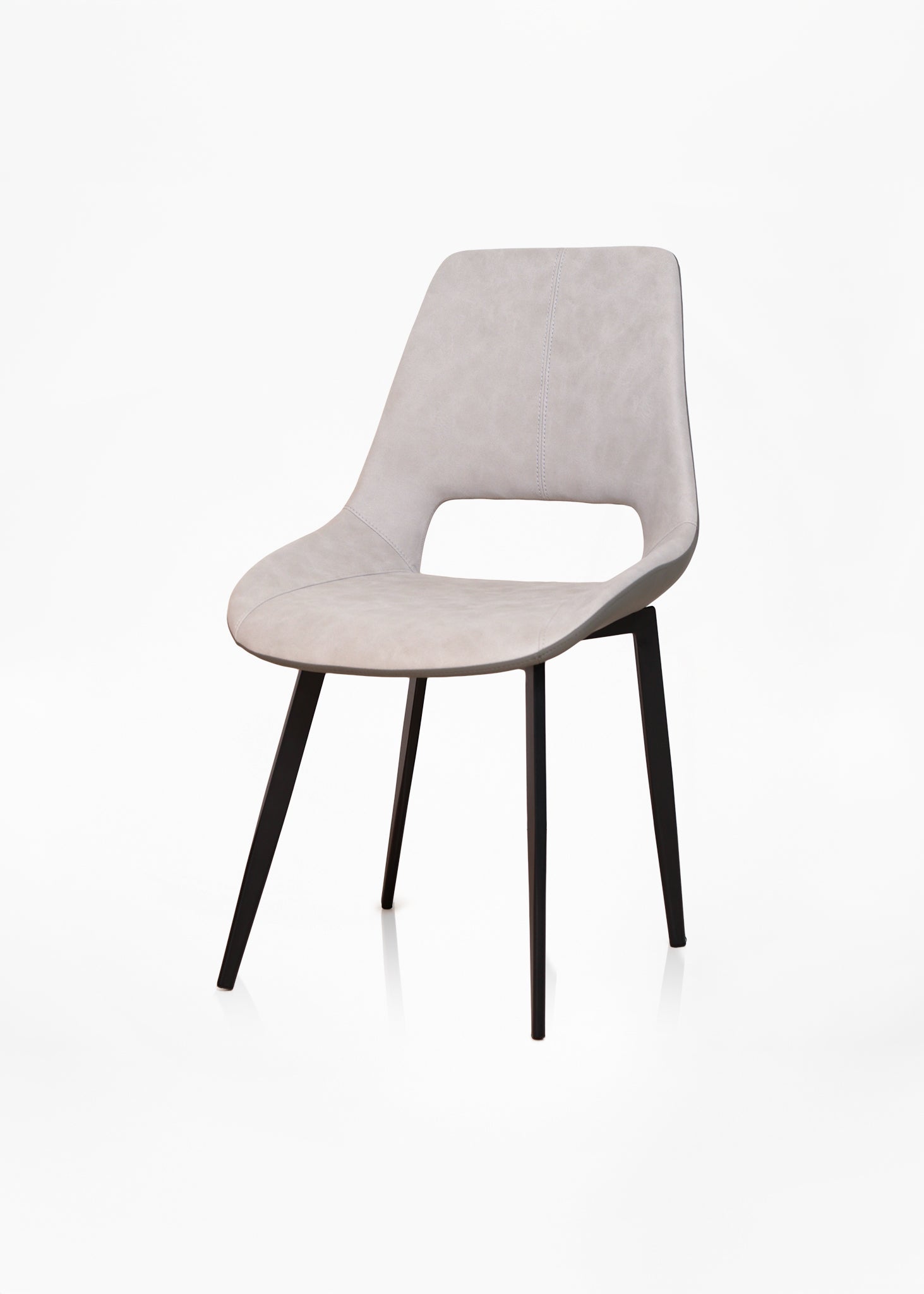 Silla para comedor estilo minimalista por sus líneas limpias y tapizada en cuero, color gris.