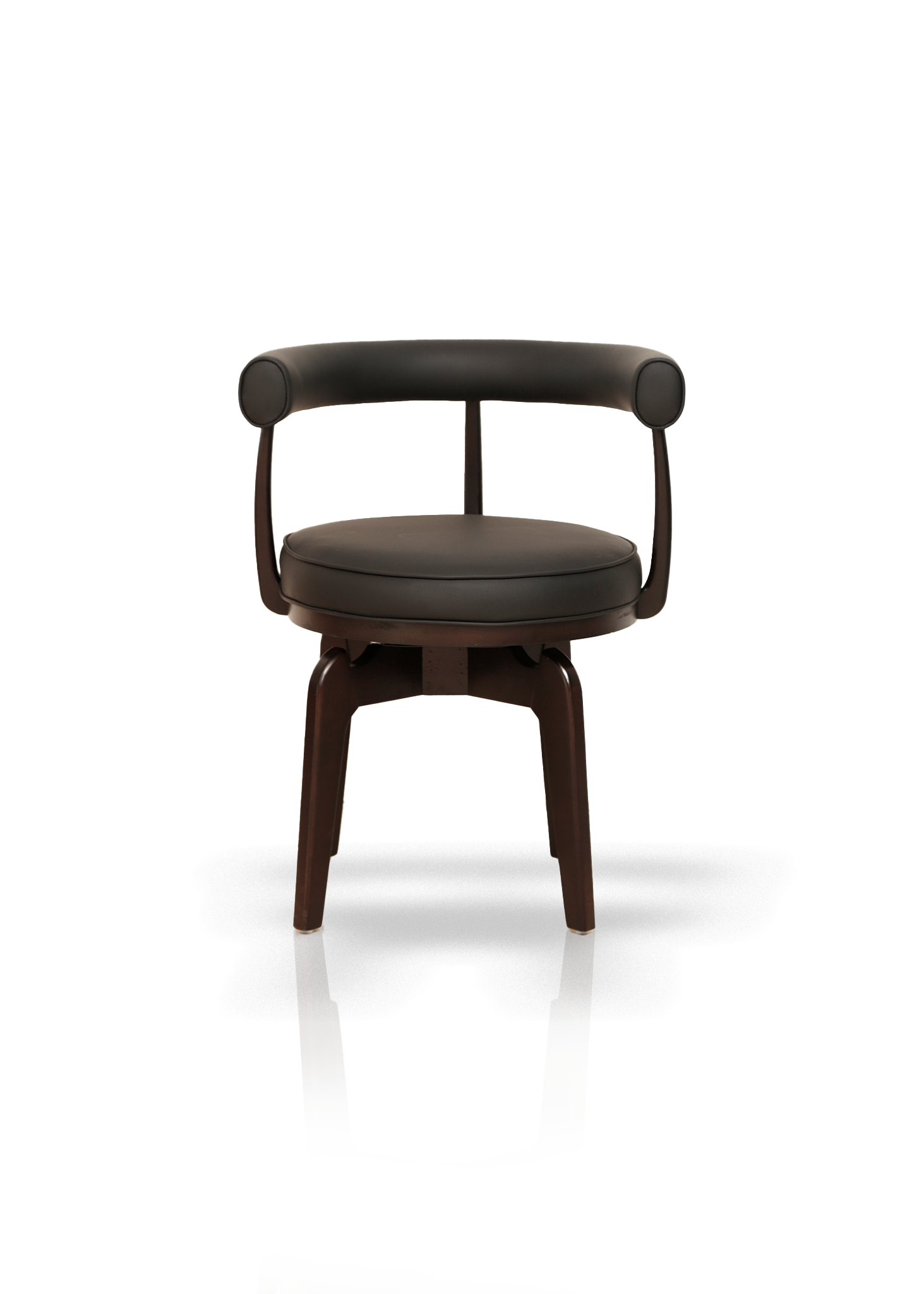 Silla de diseño moderno con asiento giratorio y respaldo tapizados en piel sintética. Ideal para espacios sofisticados y contemporáneos.