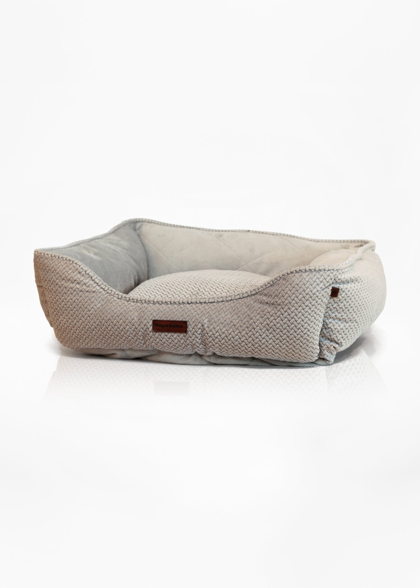 Cama rectangular para perro de color gris claro con bordes acolchados y superficie interior suave y tejida. Su diseño brinda comodidad y soporte, ideal para el descanso de tu mascota. El borde elevado permite que el perro repose la cabeza, mientras que la base amplia proporciona espacio para estirarse.